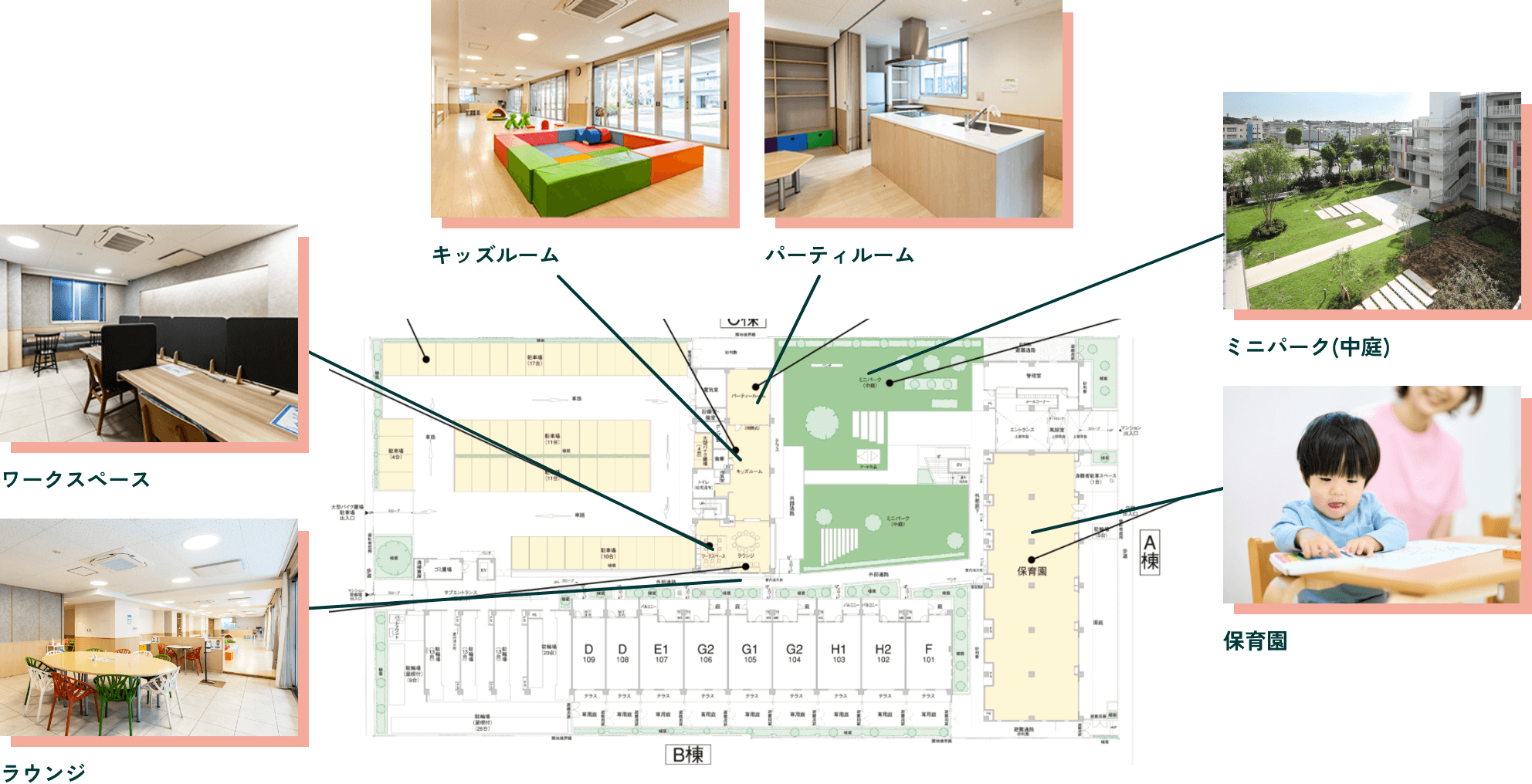 暮らしの中に、子育てに役立つ設備と、多彩なコミュニティスペースをご用意。