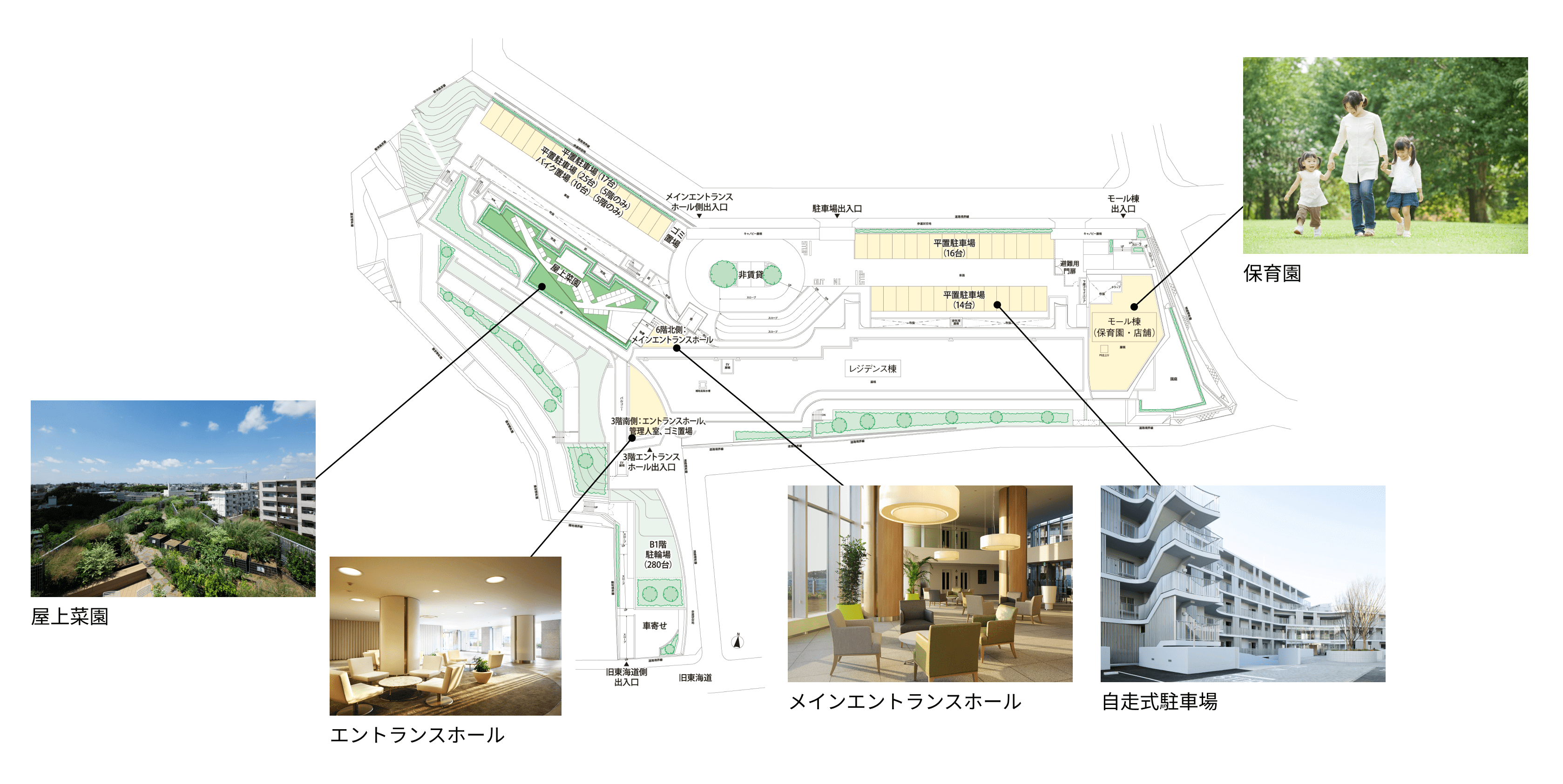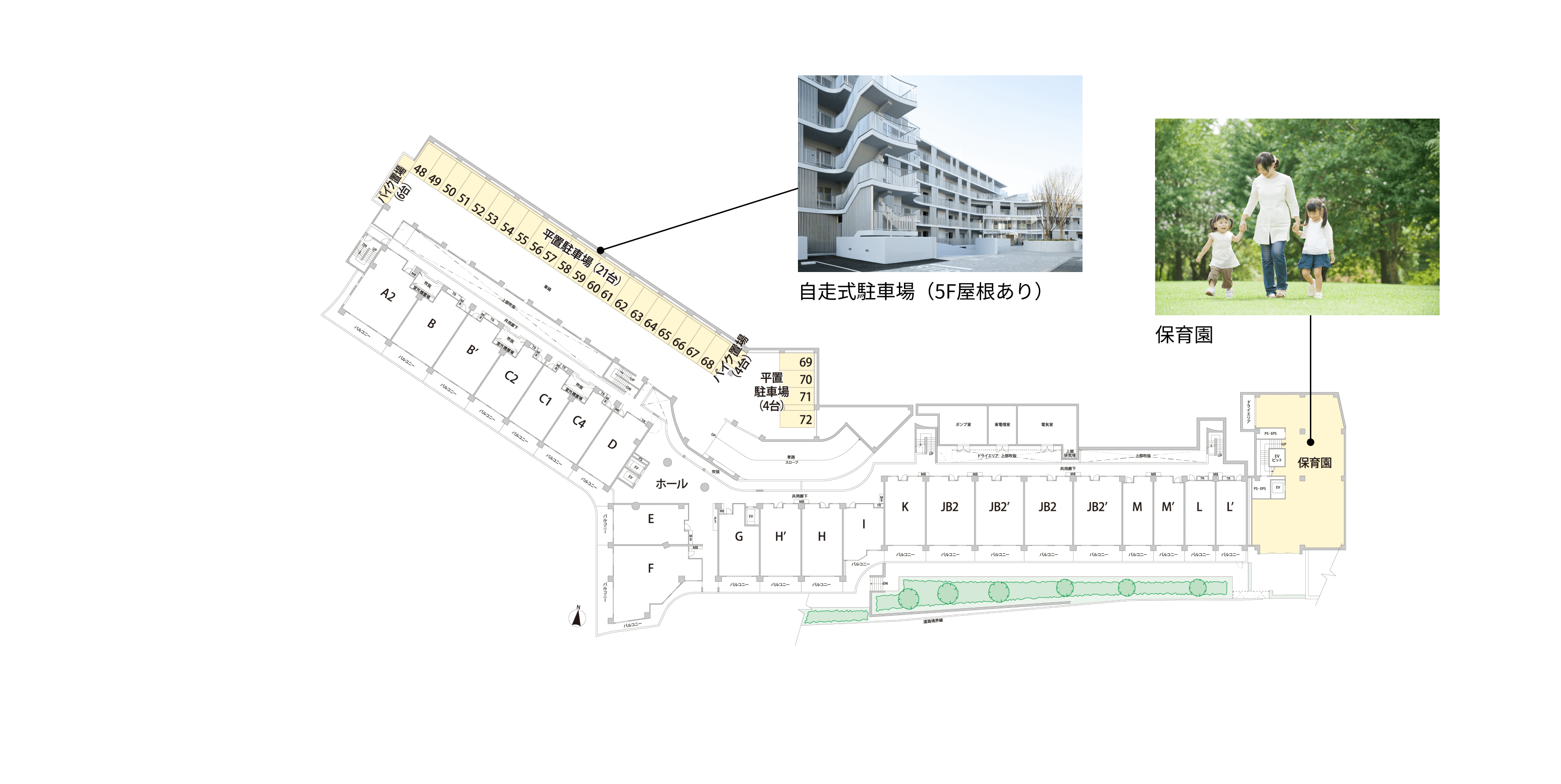 隣接するモール棟に認可保育園「アイン高島台保育園」を併設。登園・降園の移動負担を減らせるように、働くママとパパの子育てを、マンションが応援。